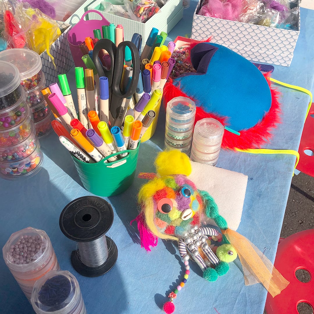 布用ペン、毛糸、刺繍糸、ビーズ、スパンコール、羊毛フェルト...などなど、店主が選んだちょっとめずらしくてかわいい材料を自由に使って、じぶんだけのオリジナルぬいぐるみを作リましょう!おうちから、捨てるに捨てられないハギレやボタン、リボン、拾ってきた木の実や小枝など材料を持参くださっても楽しいです!